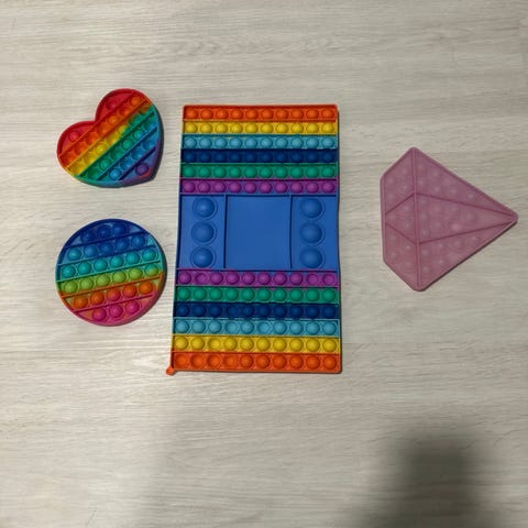 Fidget pop it lelut, yksi ehjä ja kahdesta otettu parit palat pois.