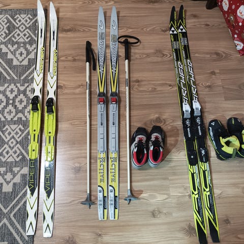 Myynnissä kahdet sukset ja monot sekä yhdet sauvat.
