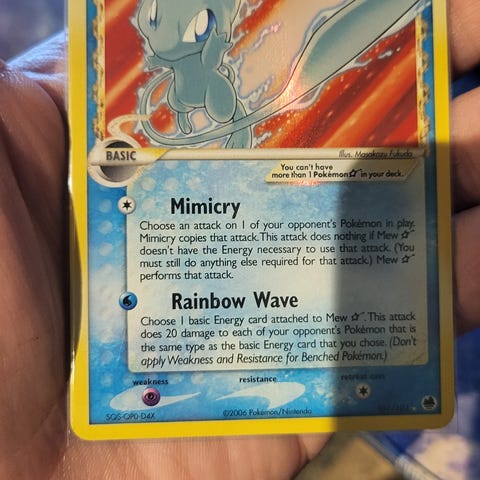 Pokemon mew lv. 39 Rumble sleevessä ja toploaderissa.