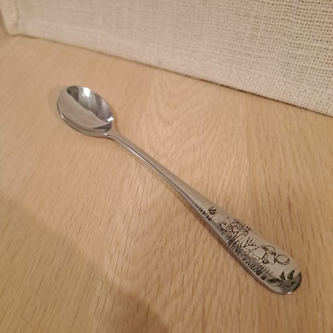 Hackman Muumi pitkä lusikka, valmistettu ruostumattomasta teräksestä. Lusikassa on Muumi ja Nuuskamuikkunen.