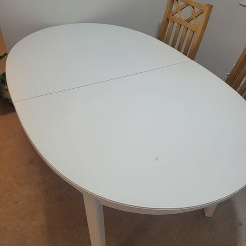 Tuoleista lähtenyt nahan paloja ja pöydänkin pinta ottanut osumaa. Maalitahroja yms.