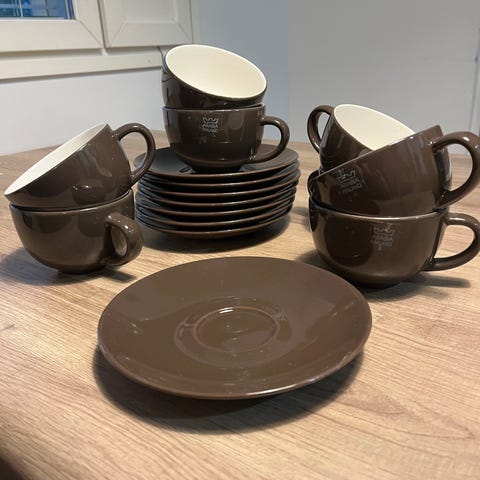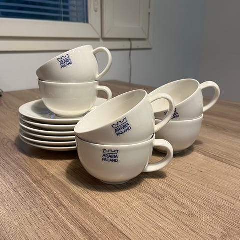 Arabia 24h sarjan kahvikupit sekä lautaset niille. Yhteensä 7kpl. Kupit olleet vain muutaman kerran käytössä, joten kunto kuin uusi. Kupin tilavuus 0.26l ja lautasen halkaisija 17cm.