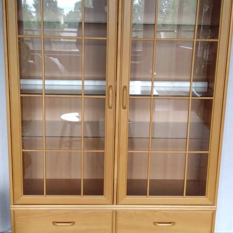 Valkoiseksi maalattu vitriini. Lasissa pieni halkema(viimeinen kuva)