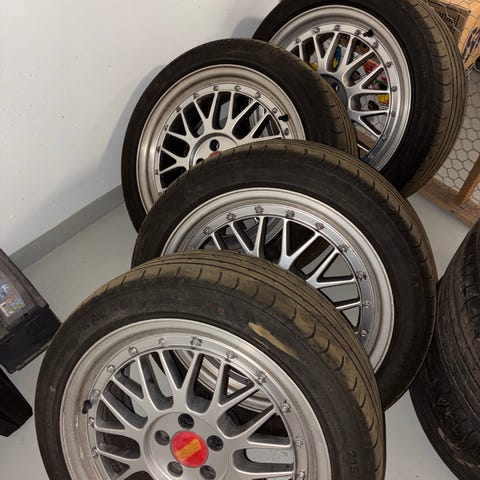 4works(?) Alumiinivanteet kesärenkailla. Naarmuja jokaisessa vanteessa. Suoruudesta en osaa sanoa kun en autolla ajanut. Purin osiin vain.