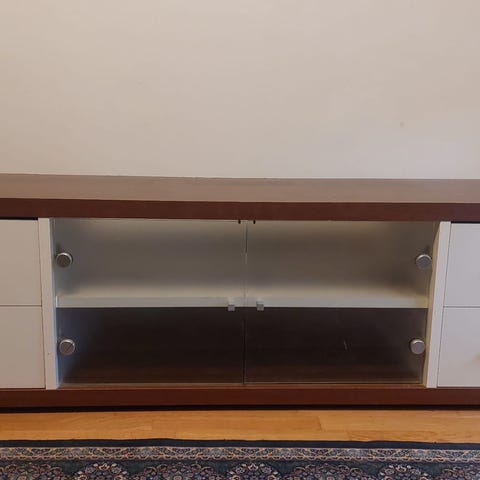 Myydään kuvan TV-taso. Mitat 160cm (L), 41,5cm (S) ja 44,7cm (K). Siistissä kunnossa, pari kolhua, joista toinen kannen sivureunassa ja toinen keskellä olevan avohyllyn alaosassa. Kolhuista kuvat (3 ja 4). Kaukaa näihin ei kiinnitä huomiota.
