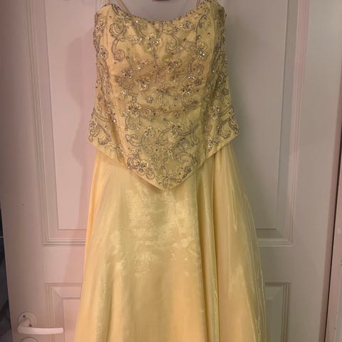 Yhdet vanhojentanssit tanssittu mekko. Väri: turkoosi/kulta