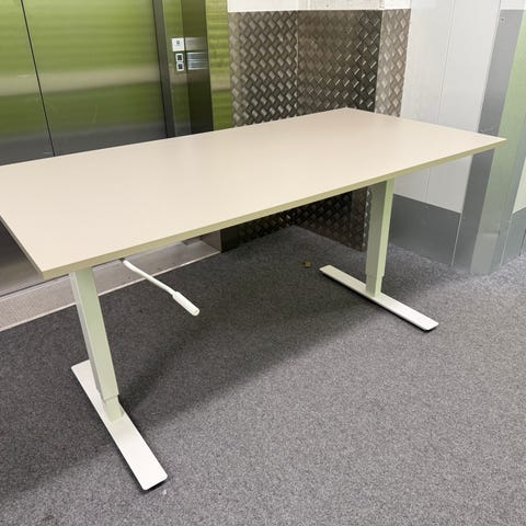 Valkoinen työpöytä 160x80 cm tasolla. Korkeussäätö 70-120 cm manuaalisesti säätökammella, jonka saa pilloon pöydän alle. Kuten IKEA Trocken pöytä. Pöytäpinnassa muutama erittäin pieni jälki. Myydään tarpeettomana, maksu mobilepay tai käteinen. Vain noudettuna paikan päältä.