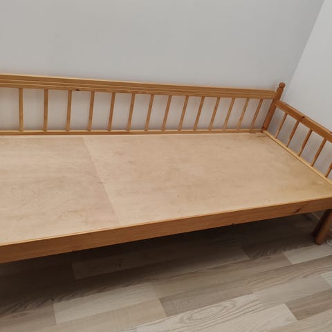 Puinen sivustalevitettävä puusohva. Yhteen kulmaan mäyräkoira tehnyt taideteoksen. Tästä kuva ja huomioitu hinnassa.