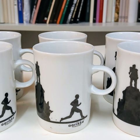 Aarikka Allu muki, jossa on pingviini-kuvio. Valkoinen posliinimuki, jossa musta tausta ja oranssinväriset pingviinin yksityiskohdat.