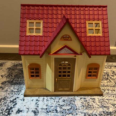 Sylvanian Families leikkitalo, joka sisältää useita huoneita ja kalusteita. Leikkitalo on suunniteltu lasten leikkeihin ja sisältää erilaisia sisustuselementtejä ja pieniä huonekaluja.