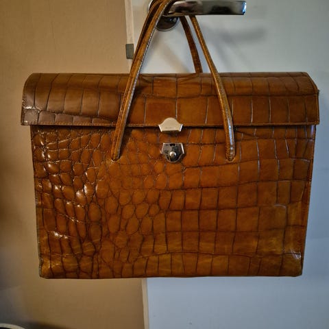 Hieno valkoinen vintage-laukku. Pohjan koko 35 x 11 cm, kork n 25 cm. Hyvin vähällä käytöllä ollut, sisäpuolella kuitenkin valkoinen vuori reunasta hitusen tummentunut. Tähän laukkuun mahtuu kivasti tavaraa mukaan, vaikka kirja tai eväsboksi. Kaksi vetoketjullista taskua.