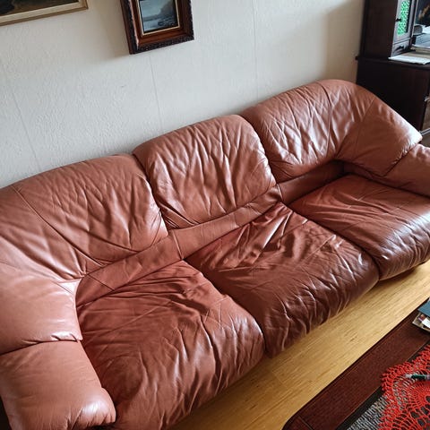 Erittäin mukava sohva, jossa nahka istuinosista kulahtanut muuten hyvässä kunnossa. Muuton tieltä seuraavalle istuttavaksi.