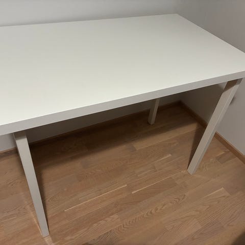 Valkoinen pöytä, valmistettu puusta ja päällä valkoinen maali. Tukevat paksut jalat ja runko. Yksinkertainen ja moderni muotoilu, sopii hyvin erilaisiin sisustustyyleihin. Maalipinnoilla käytön kulumaa, keskellä kääntyvä luukkuPöydän tyyli on moderni ja se on peräisin nykyaikaisesta skandinaavisesta muotoilusta, joka korostaa selkeitä linjoja ja käytännöllisyyttä.
