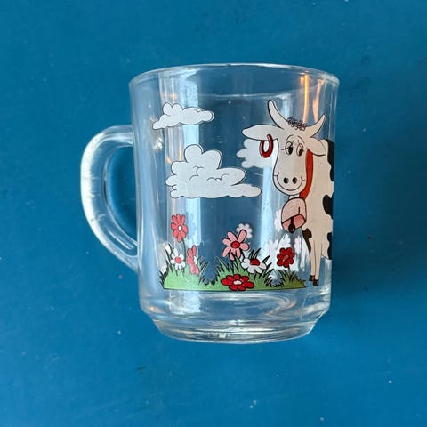 Lehmäkallo, jossa on koristeelliset mustat kuviot ja mustat sarvet. Käytetty koriste-esineenä, sarvet ovat rikki.