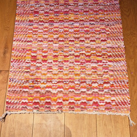 Uusi puuvillaisesta (lakana) kuteesta kudottu matto. Loimi luonnonvalkoinen 12-säikeinen kalalanka. Maton koko 77 cm x 2,20 m + hapsut. Nouto Hämeenlinnasta, kulkeutuu lähes viikoittain Riihimäelle tai toridiili.