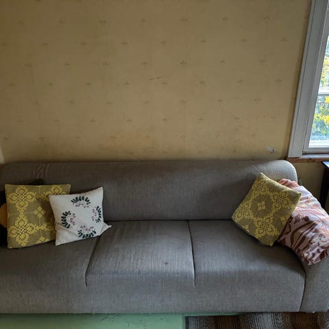 Sohvatyynyt pesty, yhdestä tyynynpäällisestä vetskari rikki.
