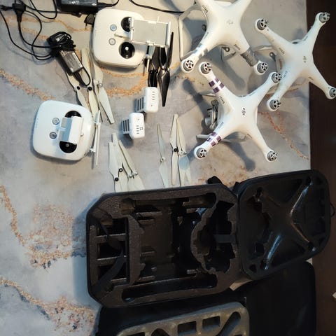 DJI Phantom 3 drone mukana laukku ja ohjain. Valkoinen drone, jossa kultaiset raidat. Sisältää lisävarusteita kuten varavirtalähteen ja suojalaukku.