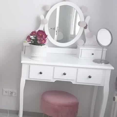 Siisti Jyskyn meikkipöytä laatikoilla, hankittu 3 vuotta sitten, nyt ylimääräinen. Toinen peilin ruuveista "viettynyt". Peili tarvitsee uuden ruuvin, jotta pysyy paikoillaan.