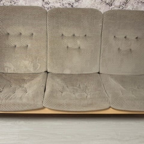 Ruskea retro sohva ja kaksi tuolia. Tuolin leveys 80cm.