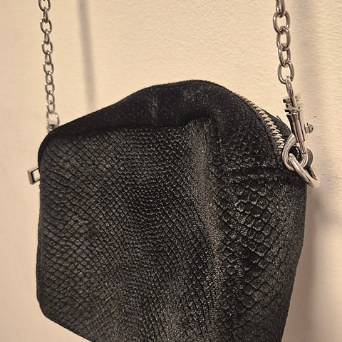 Tyylikäs musta pikkulaukku kullanvärisellä ketjuhihnalla. Klassinen ja ajaton malli, joka sopii hyvin niin arkeen kuin juhlaan. Kompakti koko, mutta tilaa tärkeimmille tavaroille (puhelin, lompakko, avaimet). Siisti kunto, lukko edessä viimeistelee elegantin ilmeen. 🖤✨