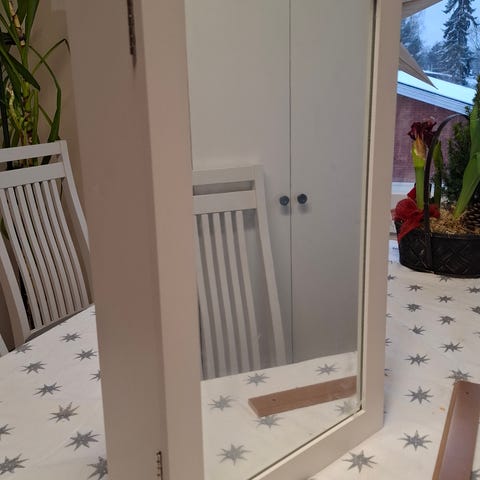 Myydään kaunis ja käytännöllinen valkoinen korukaappi peilillä. Kaapin sisällä runsaasti tilaa koruille