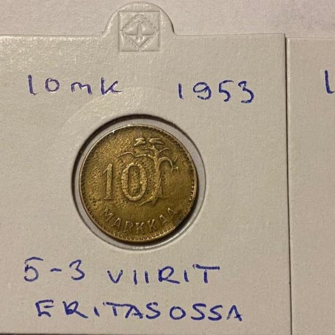 Kuvassa näkyviä erikuntoisia 5 mk kolikoita 50 senttiä/kpl.