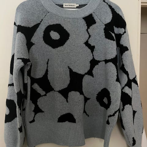 Siisti pidetty kunto. Koko L ja vastaa kokoaan. Olen M kokoisena pitänyt ja on väljähkö. Selkeinä moitteina kuvatessa huomattu haalea tahra etupuolella, voisi jollain kevyellä tahranpoistolla yrittää poistaa (esim sappisaippua). Myös niskassa olevassa Marimekon lapussa tummentumaa, mutta sepä nyt ei päälle päin kellekkään näy. Paikoin minimaalista nukkaa, en ole ehtinyt poistaa, mutta nukkaimurilla lähtenee. Mielestäni yleisilme oikein siisti ja elämää vielä jäljellä, etenkin kun hieman "huoltaa". On säännöllisesti tuuletettu ja näissä pakkasissakin saanut ulkoilla. Varanappi mukana! 51% puuvilla ja 49% villa.