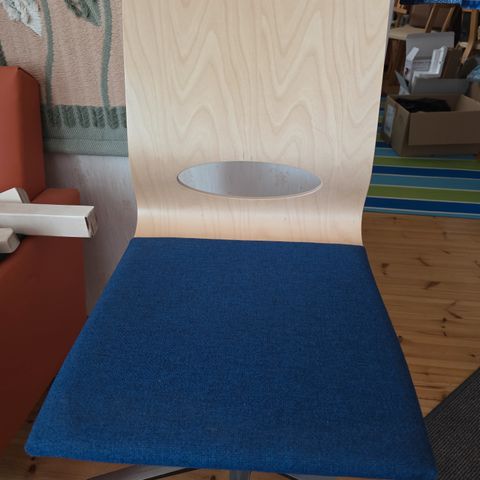 Pieni kuluma niskatuessa, muuten kankaat oikein mainiot. Tässä tuolissa ei ole käsinojia. Ristiseläntuen pumppu puuttuu, mutta venttiili pitää ilmaa kun pumppailee sisään ulkoisella pumpulla.