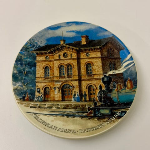 Kirsti Brandtin kuvittama maakuntakukka Tyrni seinälautanen. Halkaisija 19,5 cm.