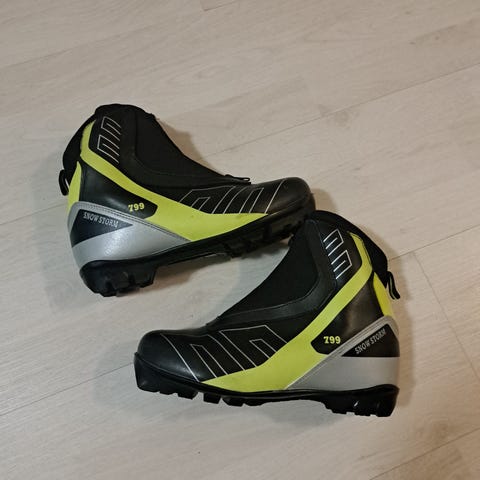 Snow Storm musta-keltainen hiihtomono perinteisen hiihtoon. Monossa on tarrakiinnitys ja lämmin vuori, pärjää hyvin kovemmillakin pakkasilla. Koko 33, pohjallisen mitta 21,5 cm. Monot on uutena ostettu ja olleet käytössä yhdellä lapsella.