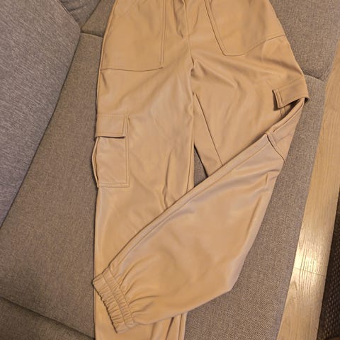 Mohito-merkkiset keinonahkahousut, koko S. Tyylikkäät, naisellinen malli — kiiltävä keinonahkapinta, leveä joustava vyötärö ja siisti leikkaus. Kunto siisti, normaalia käytön jälkeä ei havaittavissa kuvissa. Sopii bileisiin, kaupunkikäyttöön tai trendikkääseen arkiasuun.