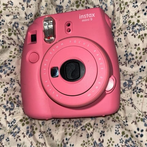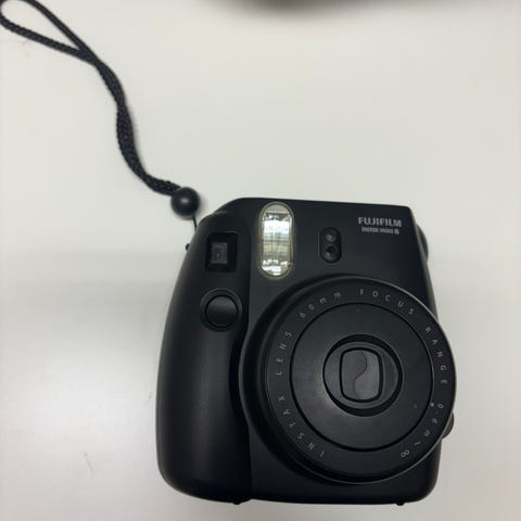 Fujifilm Instax Mini 9 -pikakamera. Mukana valkoinen suojakotelo kantohihnalla.