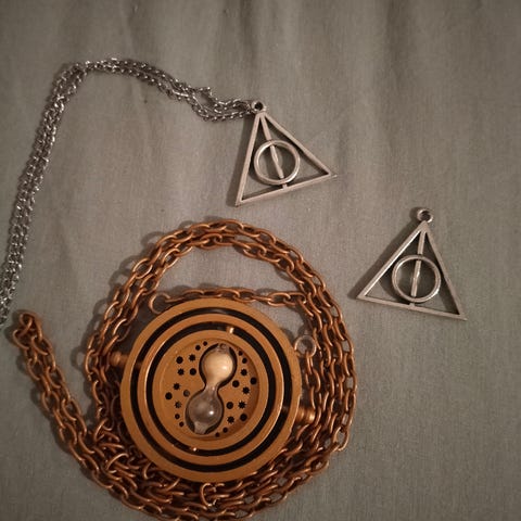 Myydään kuvan Kuoleman varjelukset-teemainen koru. Ollut vain muutaman kerran käytössä itsellä. Hinta 2 euroa.