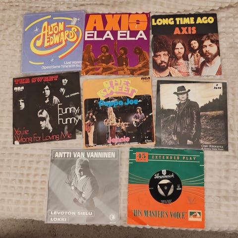 Seiskatuuman singlelevyjä pakettina. Musiikkia laidasta laitaan Glenn Milleristä diskoon + mukana myös kielikurssilevypaketti. Osassa kuvakannet tai suoja, toiset ilman. Ihan soittokuntoisia levyjä. Yhteensä 70 kpl paketti.