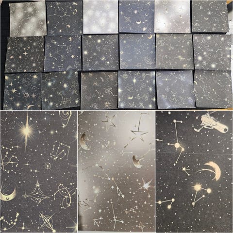 18 kpl uusia vintage henkisiä mattapintaisia papereita erilaisilla tähtitaivas kuvioilla skräppäykseen askarteluun korttien tekoon tai vaikkapa kehyksiin niin saa todella kauniit taulut sisustukseen!