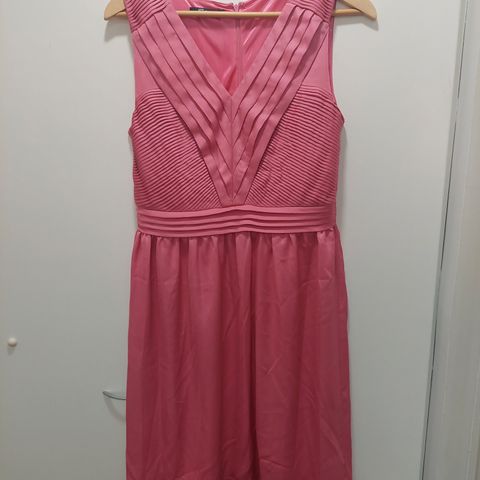 Hyväkuntoinen vaaleanpunainen juhlamekko. Yläosassa pitsiä ja läpinäkyvää kangasta.