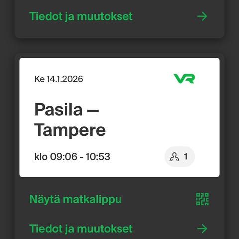 VR InterCity 140 junalippu aikuiselle Tampereen lähtöajalla 08:04. 17.01.25. Lippu sisältää istumapaikan ja mahdollisuuden muutoksiin istumapaikoissa.