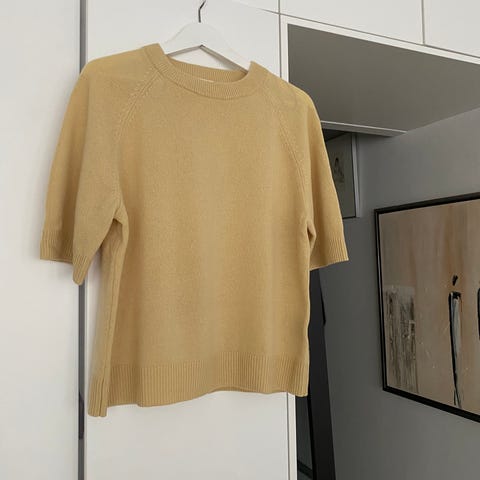 H&M:n Premium-malliston 100% villainen oversized-neulepaita lyhyillä hihoilla. Sävy syvän tummansininen / navy.