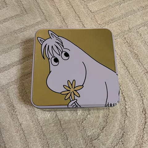 Hyväkuntoinen metallinen muumirasia.