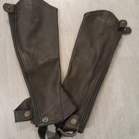 Nahkaiset chaps-säärystimet, väri tumman ruskea. Sisäpuoli pehmeää mokkaa.
