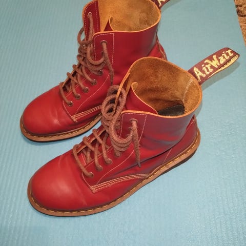 Skinhead-klassikko ajan takaa, Dr Martensin "Church Monkey"-tyylin bootsit, käytetyssä mutta hyvässä kunnossa. Käännä päät askeltaessasi, moonstomppaa poserit nurkkaan nuolemaan näppejään. Kokoa eurooppalaisittain 45 (UK10/US11, pohjallisen sisämitta 29cm).