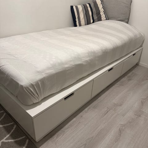 Ikean Nordli sänkyrunko 160x200 laatikostolla ja Hindrasund patjat