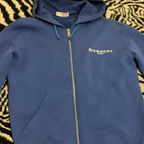 Givenchy Sininen puuvillainen miesten huppari, koko S. Valmistettu 100 % puuvillasta, valmistusmaa Portugali.