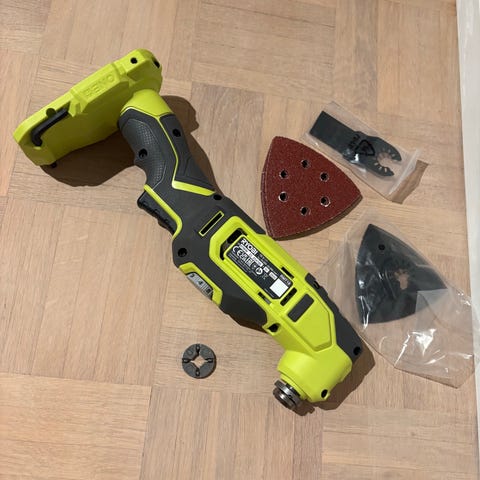Lähes käyttämätön puukkosaha+laturi+akku.sahassa vielä ensiterä kiinni