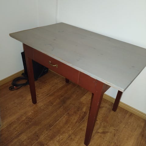 Näytti työpöytä. Vanha, mutta yleisilmeeltään siisti. Ei kuitenkaan uudenveroinen. Puuta, joten on laadukas ja painava.