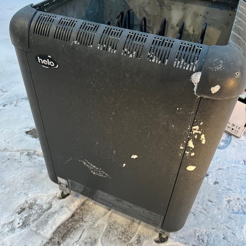 Helo sähkökiuas, musta väri, metallinen rakenne. Kiukaan yläosassa näkyvät lämmityselementit. Käyttötarkoituksena saunan lämmittäminen. 6Kw