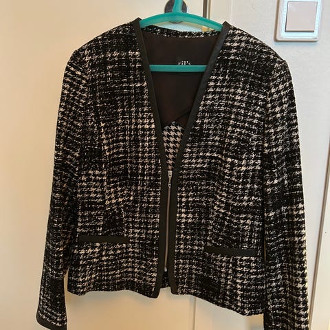 Ril’s bolerojakku naisille, koko 40. Väri musta, materiaali polyesteriä.Lyhyt malli, jossa pitkät hihat. Sisävuori mustaa kangasta.