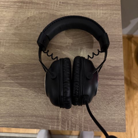 Logitech Pro kuulokemikrofoni musta. Kuulokkeet sisältävät mikrofonin ja ovat väriltään mustat. Johtoon on tullut vaurio, joka näkyy kuvan yksityiskohdista.