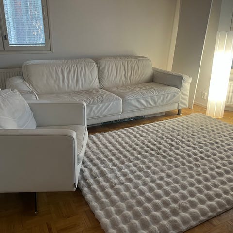 Hienokuntoinen EFG-sohva, istuin sekä selkäosa verhoiltu nahka väri musta, jalkarunko valkoinen teräs.