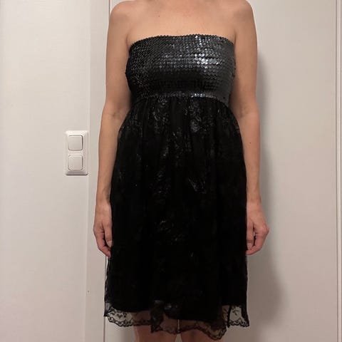 Beige juhla- tai cocktailmekko, koko S. Mekossa on paljettikoristelu, joka antaa sille juhlavan ilmeen. Sopii erityistilaisuuksiin ja juhliin.